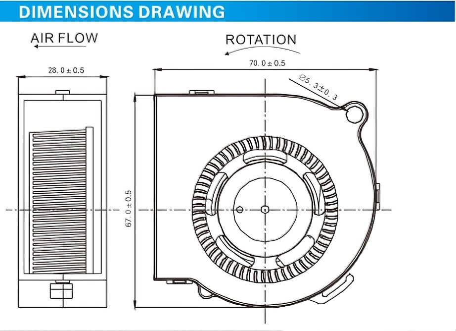 | Part NO. | mm | Type | VDC | RPM | CFM | mmH₂O | AMP | WATTS | dBA | g |