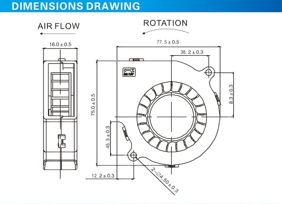 | Part NO. | mm | Type | VDC | RPM | CFM | mmH₂O | AMP | WATTS | dBA | g |